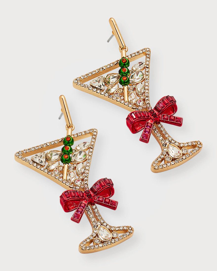 Bring a playful twist to your holiday look with BaubleBar’s Holiday Spirits earrings. Shaped like a martini glass and topped with a skewer of olives and a festive red bow, they’re equal parts cheeky and chic. Made with gold-tone brass, glass stones and enamel detailing, these 2-inch statement earrings are perfect for everything from holiday cocktail parties to New Year’s Eve.