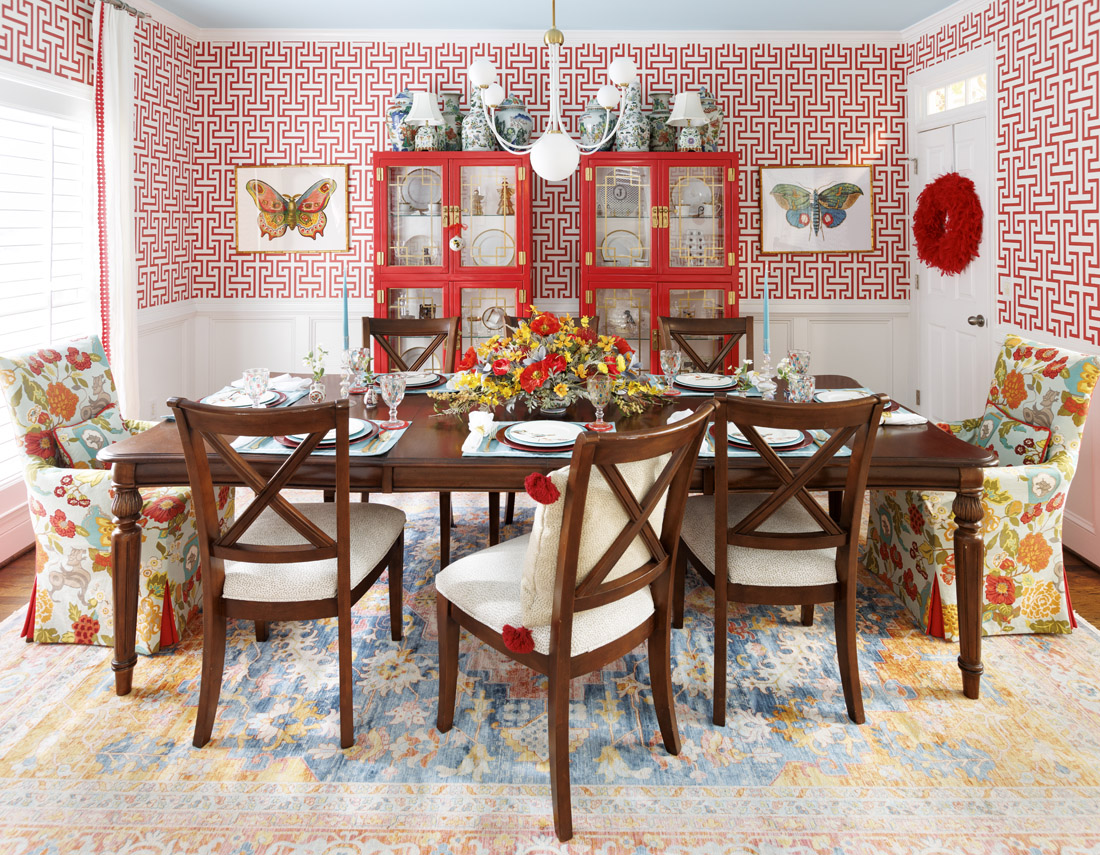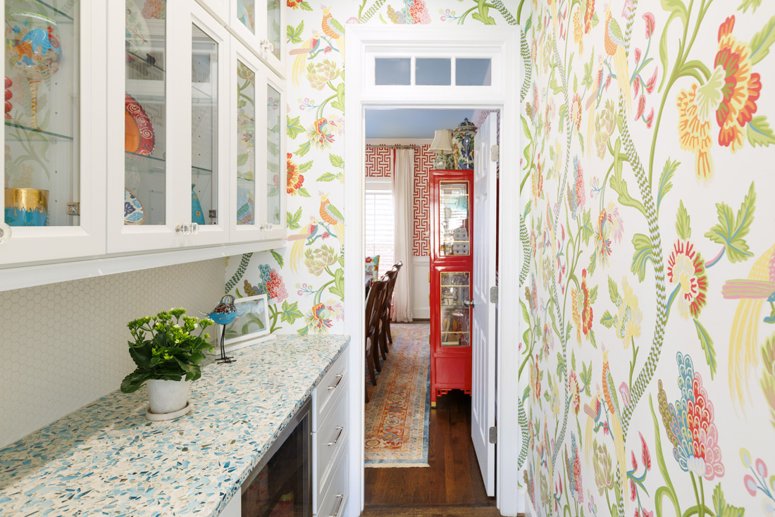 The contrasting red and blue color palette was inspired by a few of Garner’s life touchpoints, namely a vase and flower combo and a necklace, as well as an existing rug that is now displayed in the dining room. Prince was tasked with juxtaposing the bold with places for the eye to rest, as well as the masculine and feminine. For example, the Greek key dining room wallpaper and red lacquered china cabinets from Etsy are balanced by the painterly flora and fauna wallpapers in the powder room and butler’s pantry. Teal and blue terrazzo countertops in the kitchen find a counterpoint in white cabinetry, and the focal fireplace wall in the living room, done in Benjamin Moore’s Venezuelan Sea, finds visual relief via bright white Visual Comfort sconces. Asian influences, such as bamboo and rattan, help bring a softness.