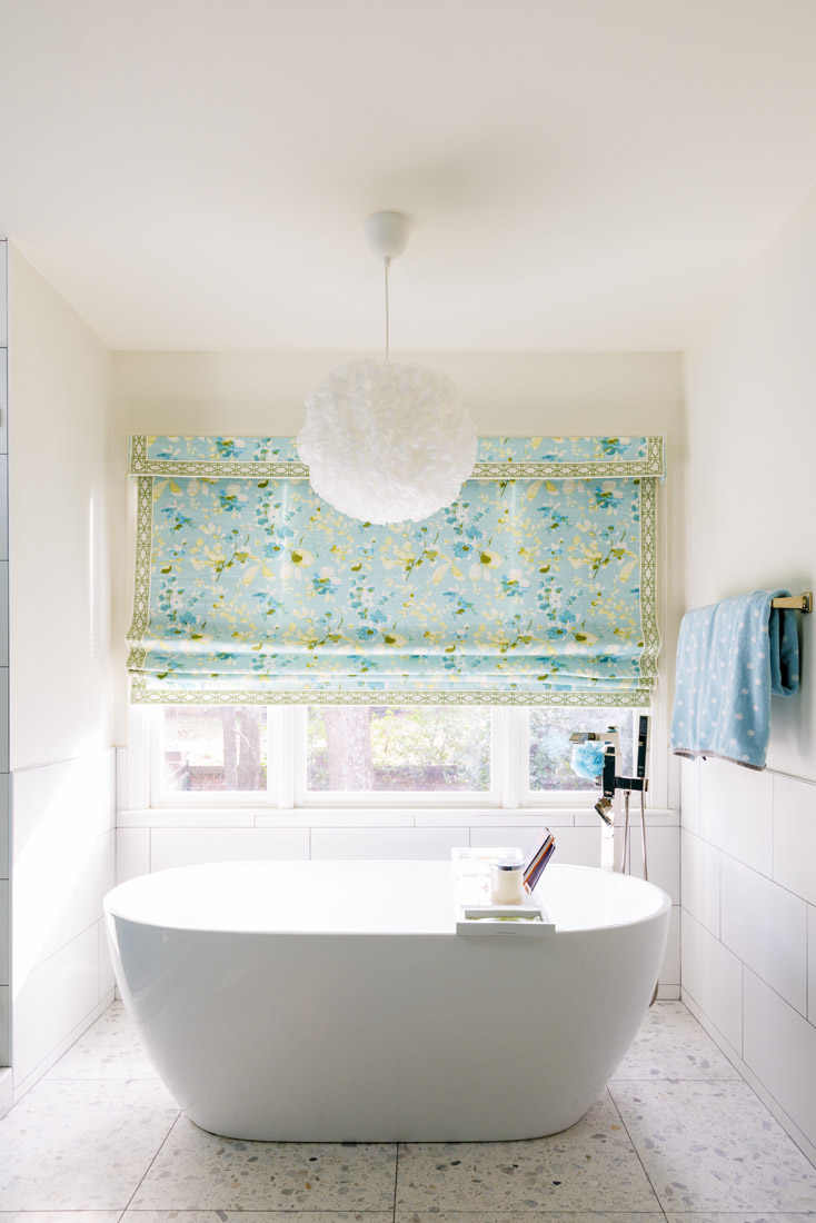 Lighting choices were also important as a throughline of Garner’s personality and balance. “Jacqueline loves fun stuff, and so do I, so the light fixtures are playful and feminine, and don’t take themselves too seriously,” Prince says. So a clear acrylic spherical light fixture replaced a beige ceiling fan in the living room, instantly bringing in personality and functional lighting, and a blown glass turquoise balloon pendant hangs above the breakfast nook. “There’s not a room in her house that’s not exciting,” Prince says.
