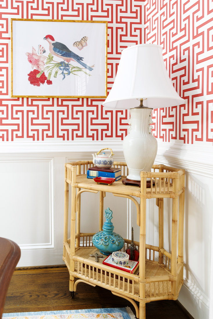 The contrasting red and blue color palette was inspired by a few of Garner’s life touchpoints, namely a vase and flower combo and a necklace, as well as an existing rug that is now displayed in the dining room. Prince was tasked with juxtaposing the bold with places for the eye to rest, as well as the masculine and feminine. For example, the Greek key dining room wallpaper and red lacquered china cabinets from Etsy are balanced by the painterly flora and fauna wallpapers in the powder room and butler’s pantry. Teal and blue terrazzo countertops in the kitchen find a counterpoint in white cabinetry, and the focal fireplace wall in the living room, done in Benjamin Moore’s Venezuelan Sea, finds visual relief via bright white Visual Comfort sconces. Asian influences, such as bamboo and rattan, help bring a softness.