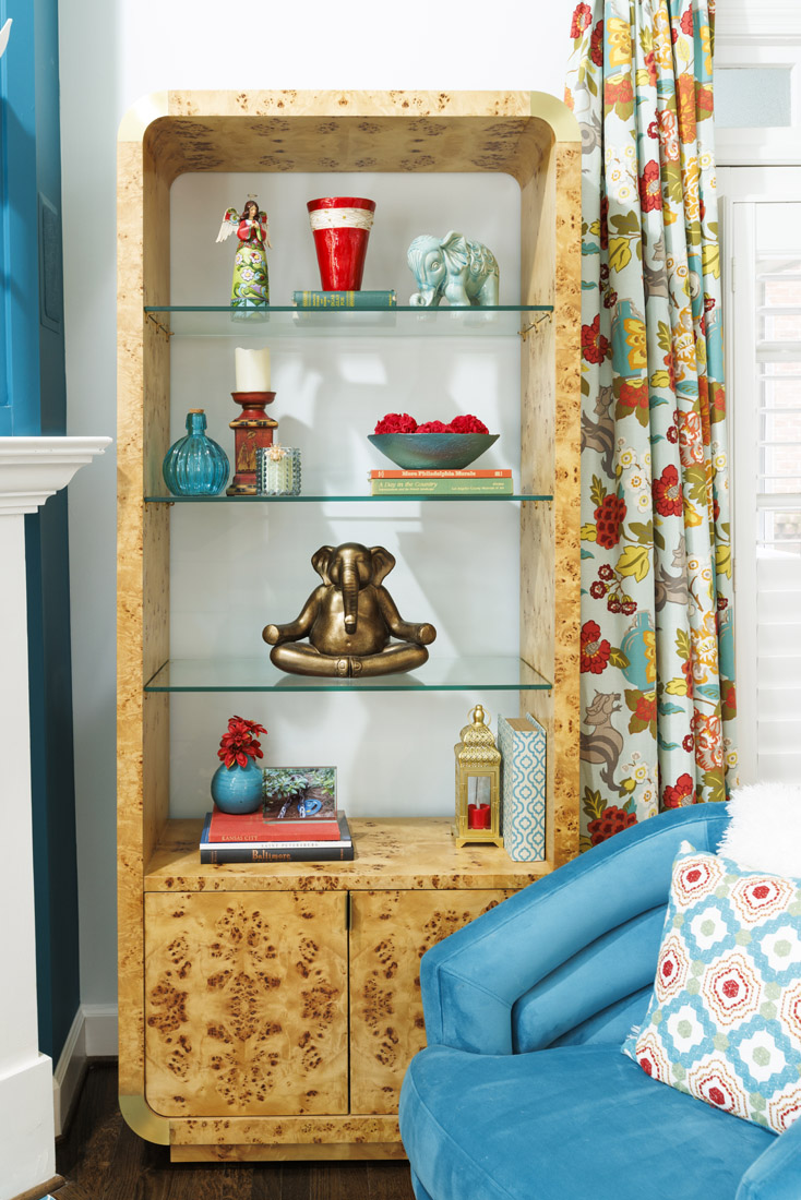 1. The burlwood etagere in the living room adds warmth and texture and showcases Garner’s favorite symbol, the elephant. It offsets the drapery, made from Fabricut material. “Jacqueline loves this pattern; it was a great place to pull color from and add interest to make it feel more layered and beautiful,” says Prince.