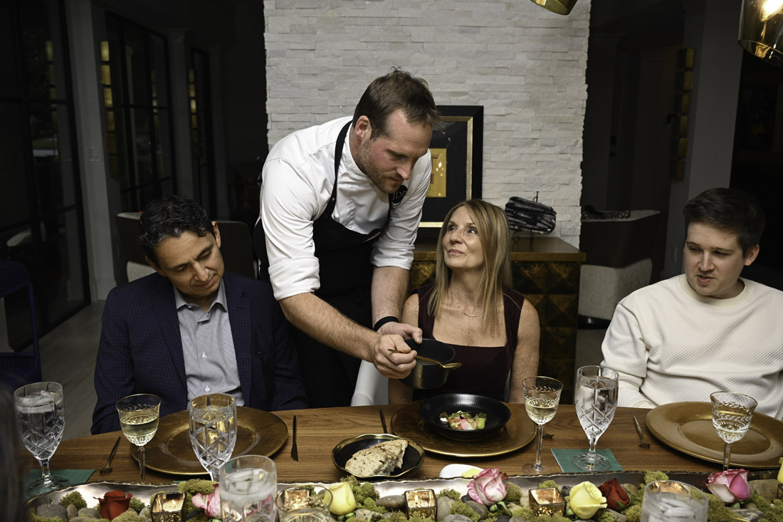 After whetting our appetites with starters, we settled into our seats at the dining table for a five-course meal. Our group was perhaps unusual in an age of ultra-specific dietary restrictions: No one had anything they requested to avoid when the chef asked. However, he was prepared for just about anything. “I always bring back-ups so that I can adjust every dish, just like at a restaurant,” he says, noting that proteins can be switched out and ingredients omitted as needed.