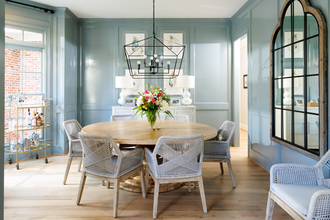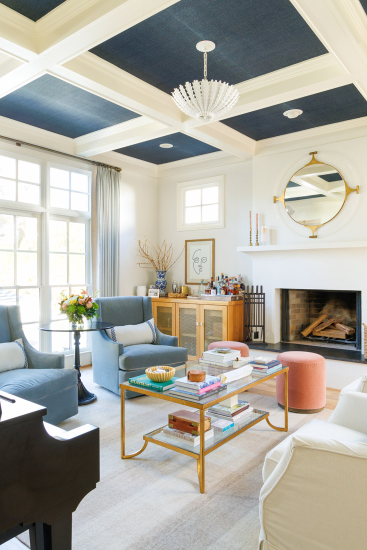For example, the couple has a zero-tolerance upstairs screen policy. Kindles aside, phones, tablets and video games are regulated to the first floor or the basement. As such, the family needed a gathering place that didn’t center around electronics. Imagined by Andrea and executed by interior designer Christi Holcombe, the family room is painted vibrant white, save the navy ceiling, while shades of blue and pink complement the space. “This room is designed for making a cocktail, playing games together, listening to the piano and singing and enjoying a fire while reading,” Andrea says.
