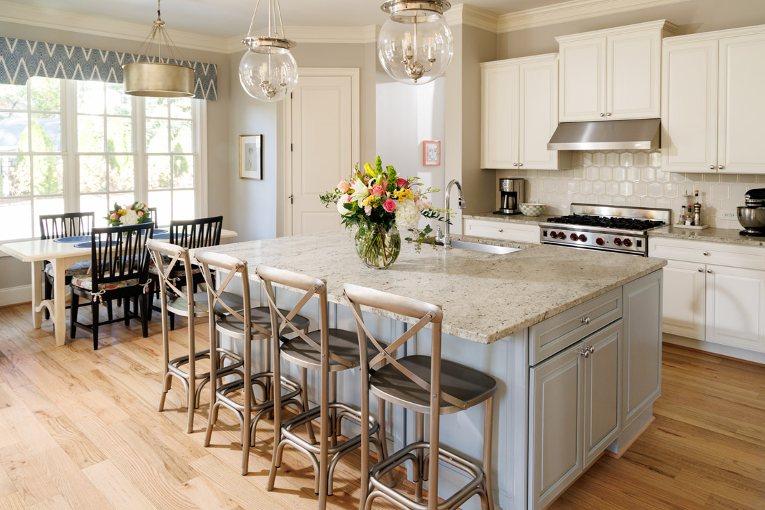 The reimagined fireplace is the room’s focal point. Rather than demolishing the original of stacked stone, the homeowners chose to honor the existing chimney and materials by hiring a mason to create an elegant transformation.