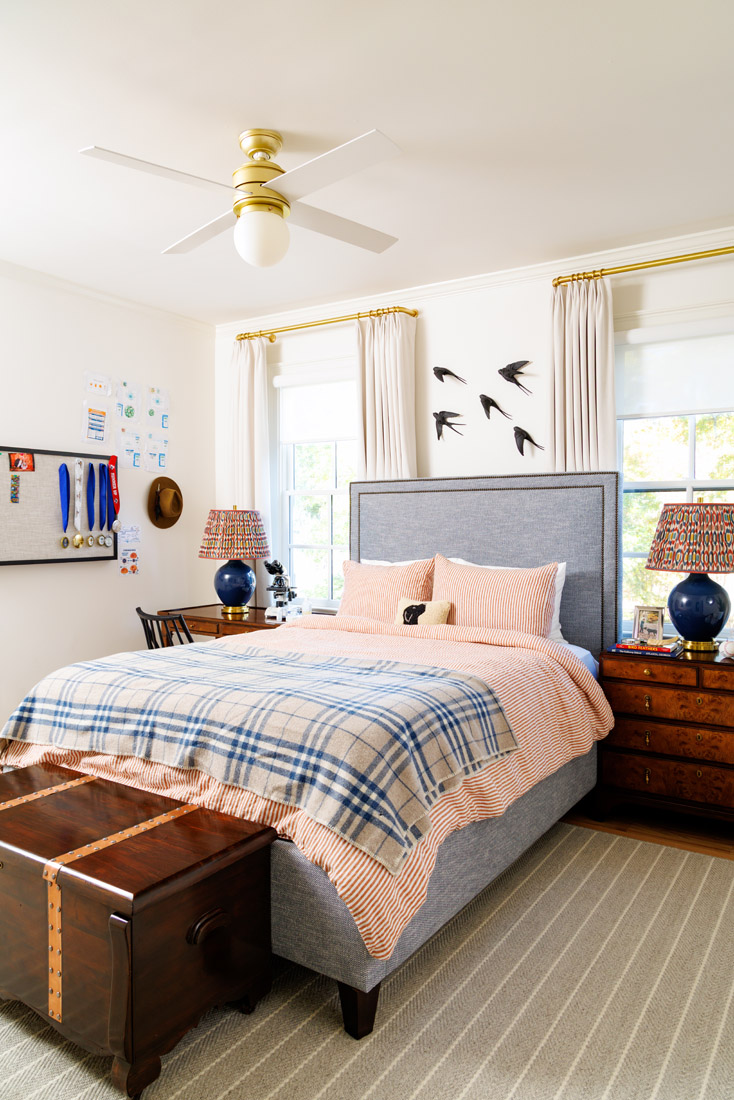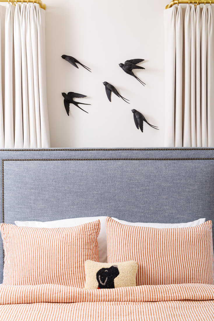 3. Above her son’s headboard, sculptural swallows from Ukraine hold special meaning. He selected them because the family frequently spots swallows during their hikes together.