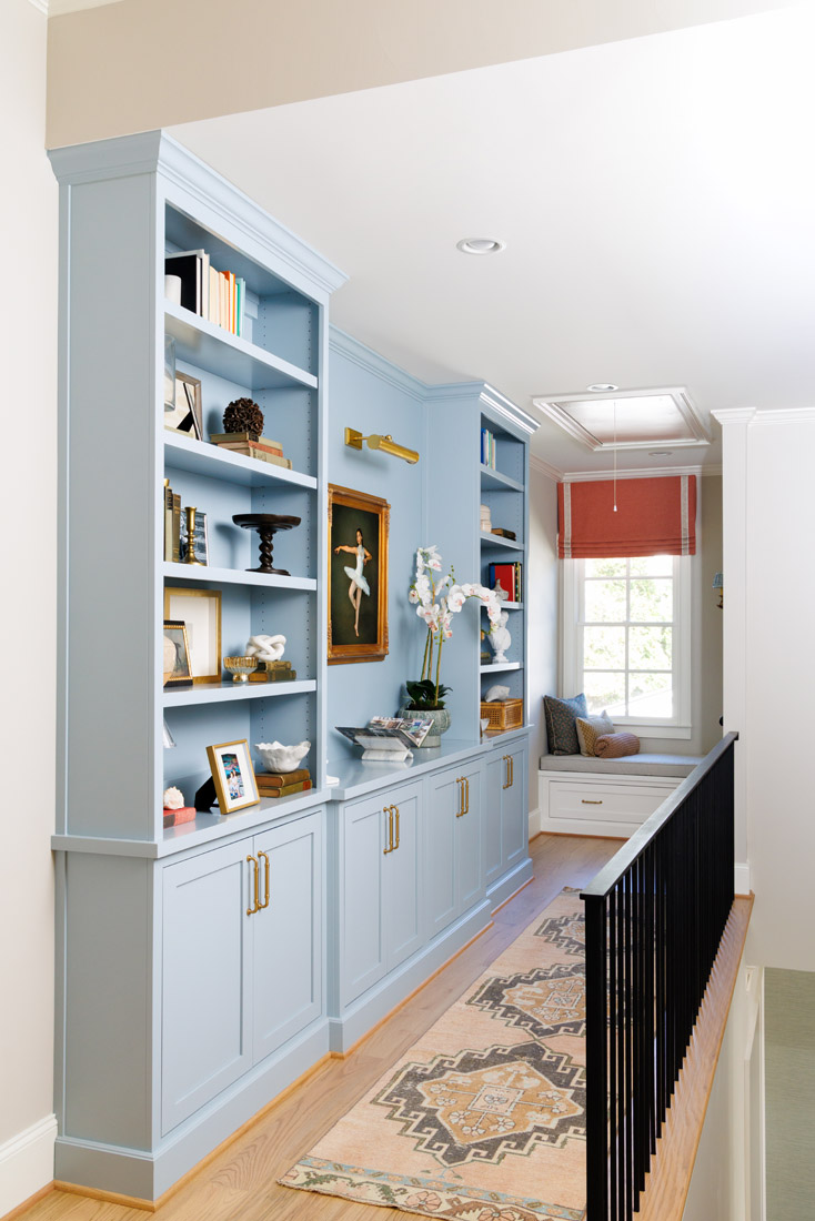 Instead of a simple, empty hallway, the Wightwicks opted for a floor to ceiling, built-in bookcase that serves as an interesting focal point, a dramatic storage solution and a place to hold family treasures. “We worked with Luxe Portraits in Atlanta to have a painting of our daughter doing ballet for this bookcase art display,” Andrea says. “The bookcase is sprinkled with shells we have found all over, up and down the East Coast, and there are books scattered from different travels. I purchased a book about Donatello in French in Round Top, Texas, for my son since he is taking French in school and loves ‘Teenage Mutant Ninja Turtles.’ He likes opening it and looking for sentences he can translate.”