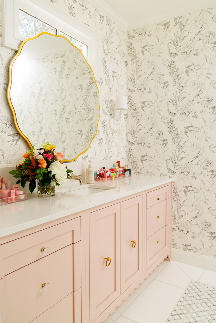 Their teenage daughter’s bedroom celebrates her deep dedication to ballet, a discipline she has pursued since age 3 and continues to practice 10 years later. Her vision centered on white, black and dusty pink, a color scheme that complemented her love of dance. In her adjoining bathroom, her secondary passion for drawing inspired the design direction, particularly the wallpaper featuring charcoal sketches of birds and butterflies. Custom cabinetry in soft pink with delicate scallop trim harmonizes with this artistic backdrop, while the backsplash extends the countertop material to maintain a cohesive, feminine feel.