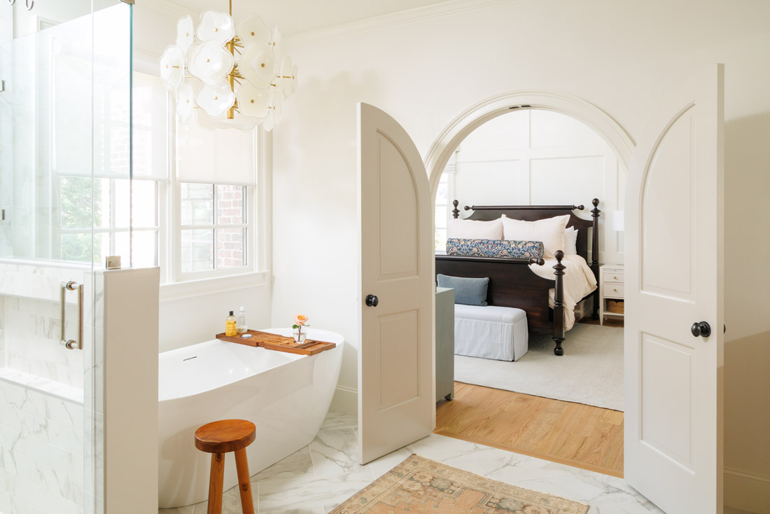 Andrea and Andy’s primary bedroom received Holcombe’s royal treatment. Clever spatial planning and a commitment to preserving heirlooms ground the room. To accommodate their shared storage needs, they installed a paneled wall with a hidden door cleverly integrated into the millwork, leading to a generously sized closet that provides ample space for the couple. “We have never shared a closet, which is the secret to our nearly 20-year marriage,” Andrea says. “If we were to share, it needed to be big!” This thoughtful, unique configuration allowed them to maximize the primary bedroom’s footprint while maintaining clean lines and visual simplicity.