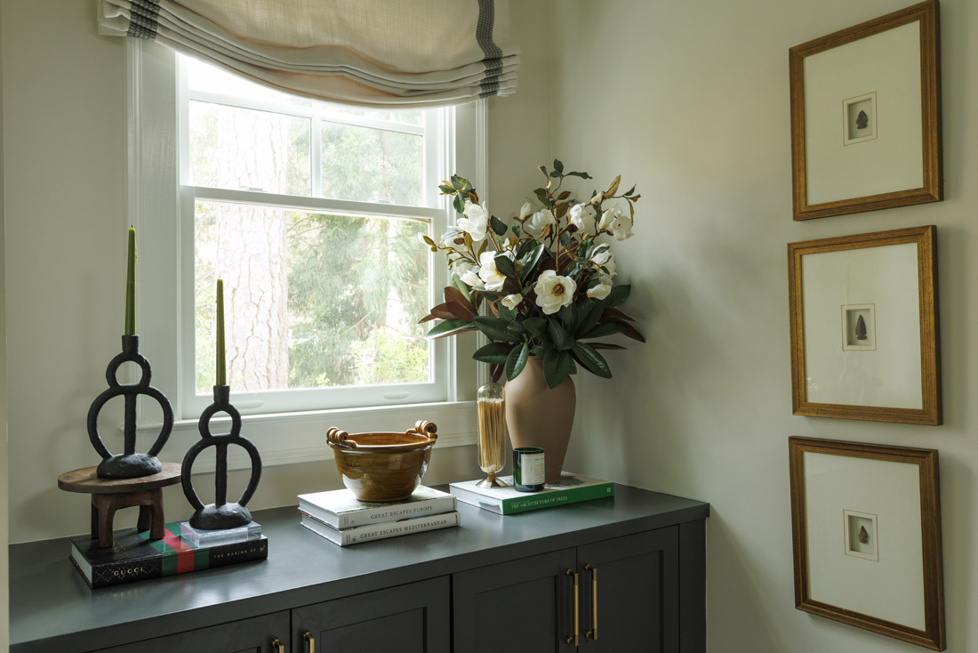 2. Intentional accessories. This black cabinetry was initially outside Davis’ comfort zone, but it is now one of her favorite elements in the room, dotted with small-scale art and pottery sourced from Atlanta-based stores.