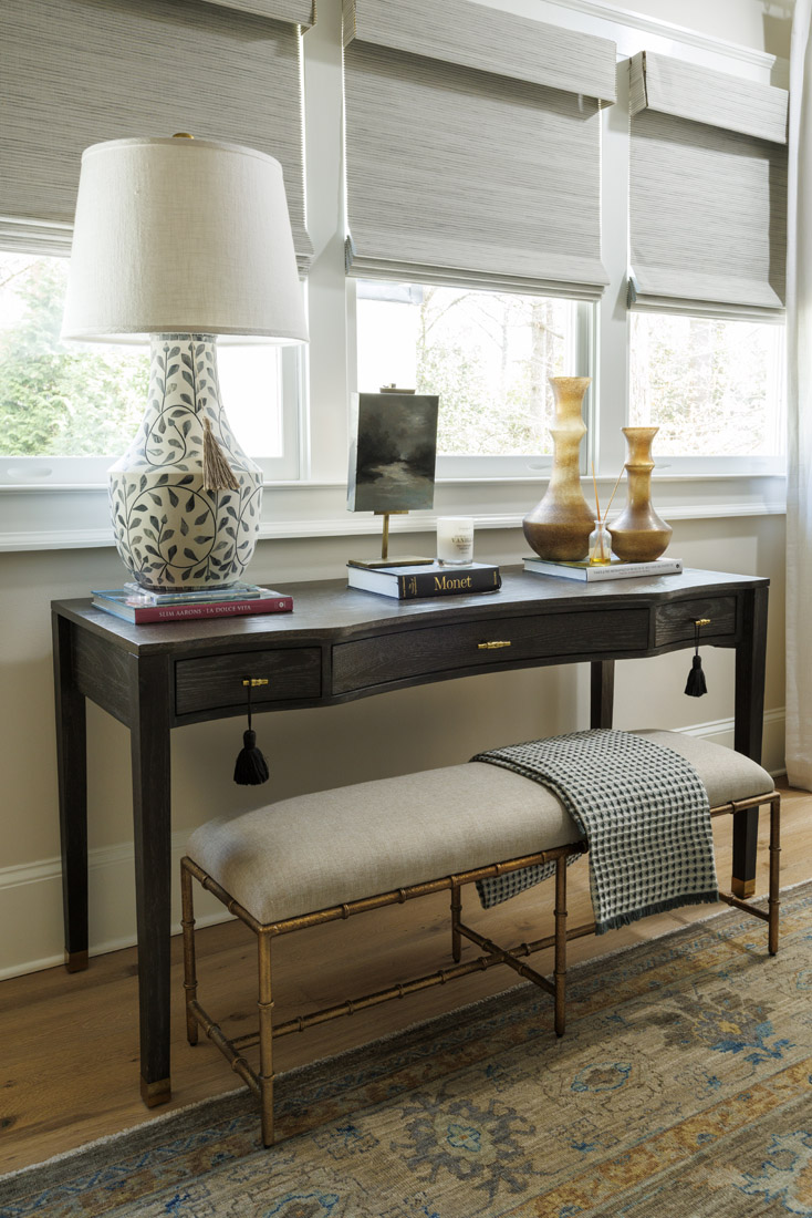 Eason and her team provided the family with a tight edit of accessories, something Davis, who identifies as a minimalist, loves. Everything is sourced and set with intention. “We included things that would stand the test of time,” says Eason, such as finds from Scott Antiques Market and pieces by local artists like Caleb Mahoney.
