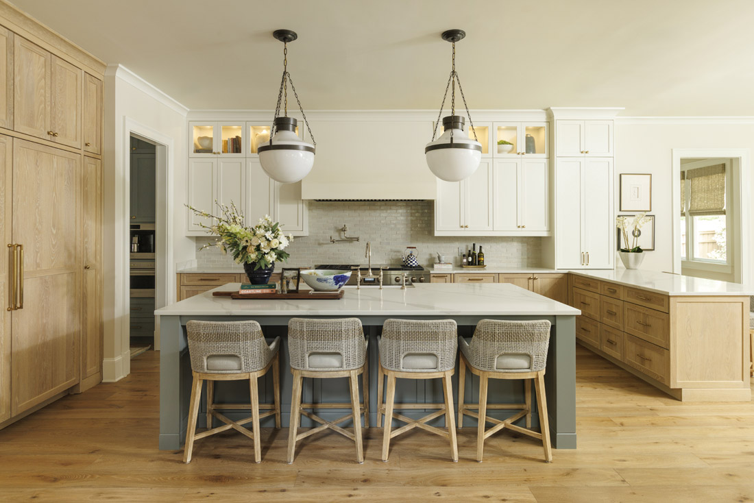 Two-tone cabinets emphasize a casual yet luxurious look. “We introduced a playful twist through a semi-tuxedo cabinet scheme. The off-white cabinetry and range hood create a timeless background, while the painted island and warm white oak bring in contrast,” says Eason. “It makes the space feel collected rather than overly formal.”