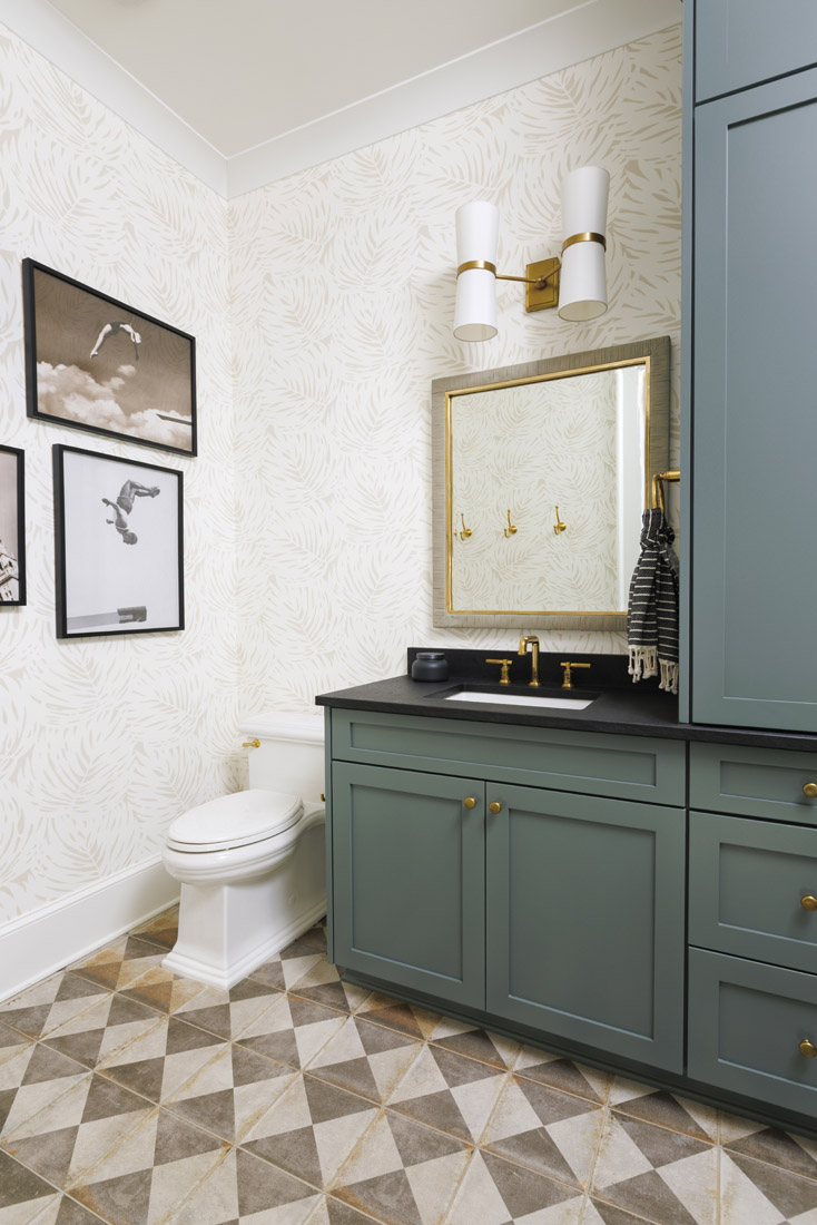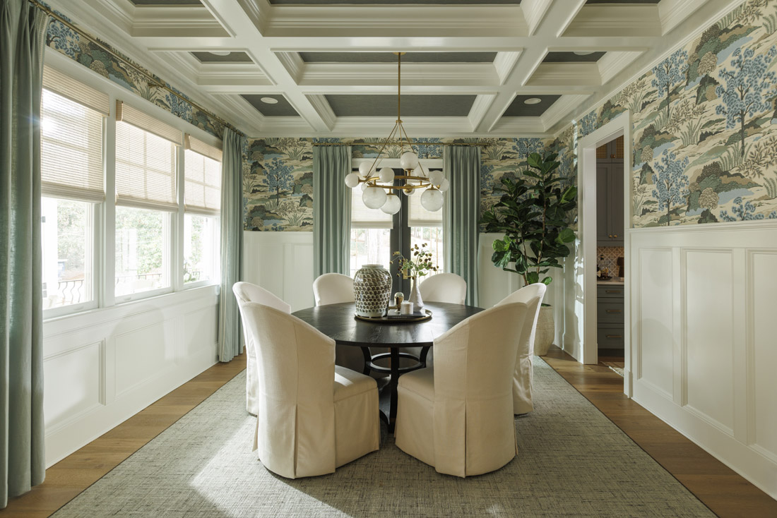 Davis’ favorite room is the formal dining room that she uses any chance she gets. A round table that seats eight is the centerpiece, complemented by custom molding and Thibaut Daintree wallpaper. “It’s such a fun room,” she says. “All the time, I have delivery people who peek in there and comment on how the room is so pretty.”