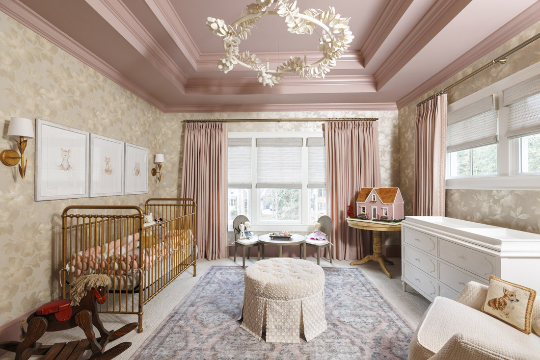 That same intention flows through the house, including in the nursery. A deep, dusty pink keeps the room from feeling too precious, while a visually arresting light fixture by Palecek adds without feeling childish. “It’s made from hand-cut petals formed from coconut shells,” says Eason. “It’s a beautiful feature in an incredibly sophisticated nursery. We wanted the room to feel fit for a princess, but not in the typical bright-pink baby girl way. It’s a dream room.”