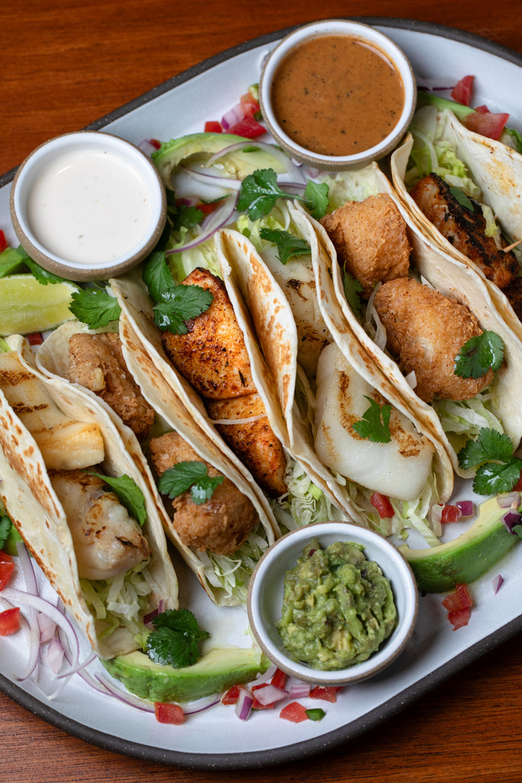 For a satisfying lunch, fish or shrimp can be blackened, fried or grilled then tucked into three soft taco shells with lettuce, tomato pico and spicy guacamole. Grouper can be sauteed or fried before it’s slid into a bun, topped with tomato, lettuce and mayo then plated alongside expertly cooked fries.