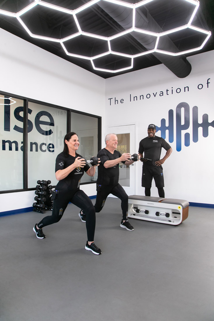 Here’s how a session goes: Clients don an EMS suit, a skin-tight, wetsuit-style garment with electric pads on key areas including shoulders, biceps, triceps, chest, abdominals, glutes, quadriceps, inner thighs, hamstrings and calf muscles. It’s tight, so it takes approximately 5 minutes to put on. Then a maximum of two clients join a 30- minute training slot with one of three on-staff trainers. Having a trio of different trainers keeps workouts interesting, and the private or semi-private sessions ensure individual attention to correct form and create modifications as needed.