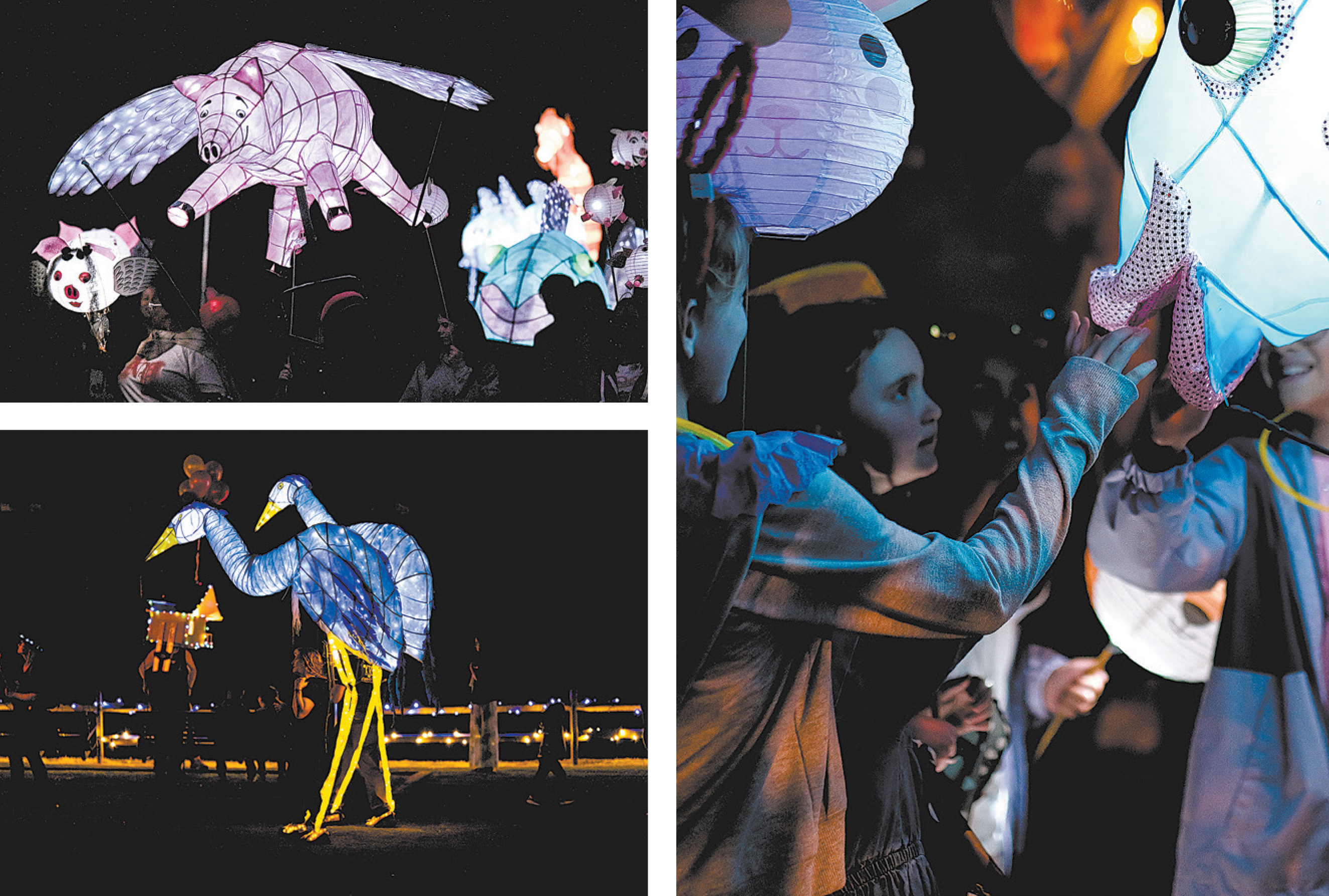 Parade artist Chantelle Rytter designed some of the more robust water lanterns, including a whimsical Georgia Kissyfish and a 26-foot albino alligator. Kayakers with Murphs Surf will pull the illuminated sculptures along the Chattahoochee River while their shimmering lights dance across the water’s surface and viewers gather at the hilltop overlook. Returning favorites include Sunny the Swamp Sunflower, Sanderson the Pig and the towering Great Blue Herons, Cornflower and Indigo. These giant puppet figures will roam Overlook Park after the parade, offering attendees an opportunity to appreciate their intricate craftsmanship up close.