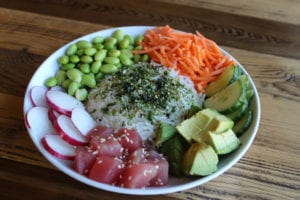 A superfood cafe, Kale Me Crazy is dedicated to house-made juices, smoothies blended from fresh fruit and vegetables, and açaí bowls made from scratch each day. Menu options include plenty of quick and nutritious choices made with organic ingredients, including raw foods such as the top-selling Poke Bowl. This specialty dish is made with wild caught ahi tuna, avocado, cucumber, carrots, edamame, radish, toasted sesame seeds and spicy vegan mayonnaise, and served on a bed of jasmine rice. Custom ingredient options are also available for all menu items.