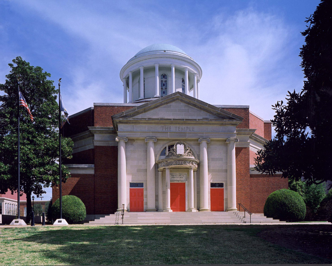 Founded in 1867 as the Hebrew Benevolent Congregation, The Temple is Atlanta’s oldest Jewish congregation. Its synagogue on Peachtree Street was designed by Philip Trammell Shutze and completed in 1931. The red brick building, arranged in a Flemish bond pattern, features rounded elements throughout, including round-headed windows, a drum dome and Roman Doric colonnades. Inside, plaster relief work, such as friezes with Jewish iconography, vaults and cornices, blends with organic elements such as terrazzo floors, black marbleized-wood columns and gilded motifs.