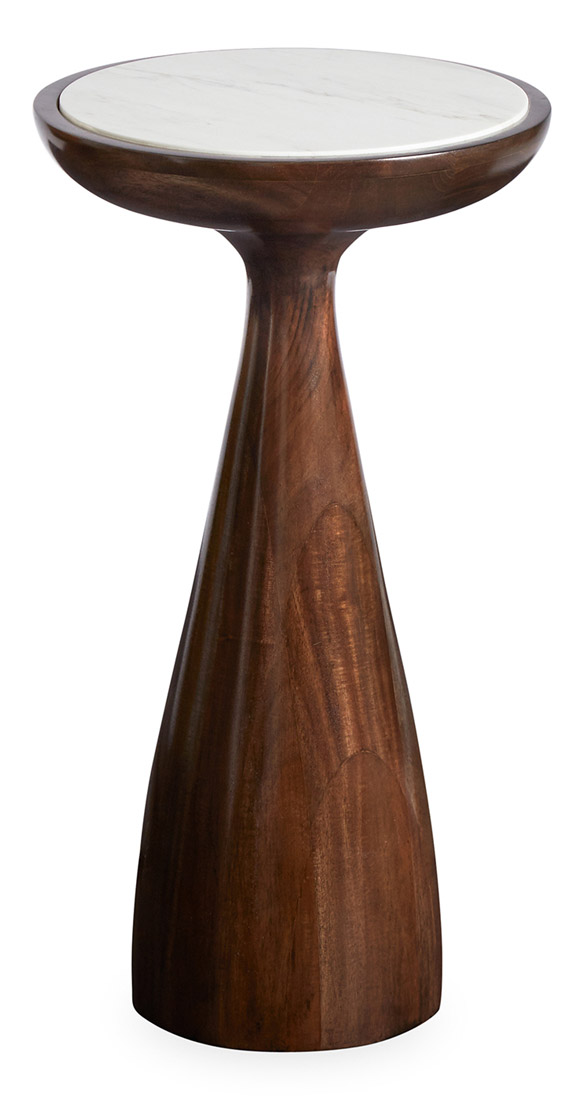 Bring curves into a room with this turned mahogany drinks table. The rich wood base has been polished to underscore the natural grain and topped with a 12-inch wide piece of white Volakas marble that’s just right for perching a favorite beverage. The table sits 22 inches high, the perfect height for pairing it with an oversized armchair.