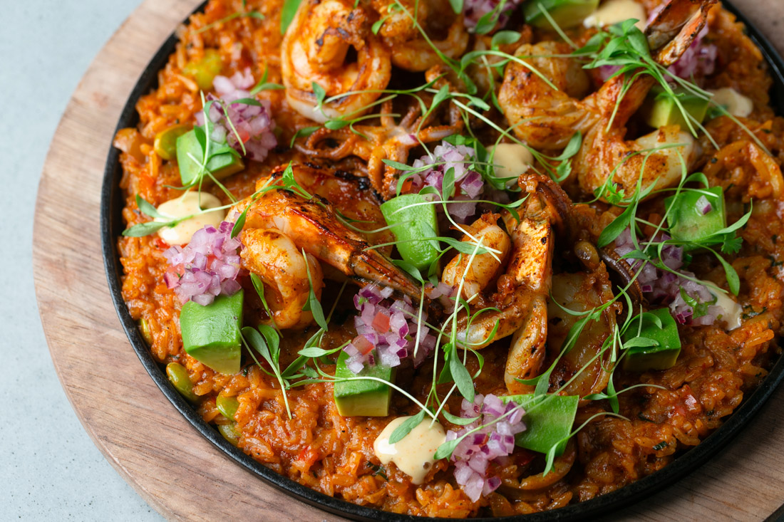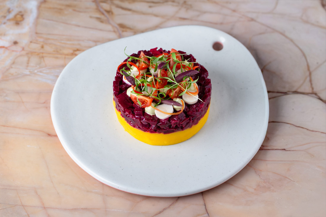 The Peruvian ceviche bar, where the focus is on the simplicity and purity of each dish’s featured ingredients, serves up a range of seafood as well as several vegetarian and vegan options. Vegetarian causa layers bright mashed yellow potatoes with red beets, cherry tomatoes, avocado aioli and microgreens; it’s gorgeous with earthy and tangy notes.