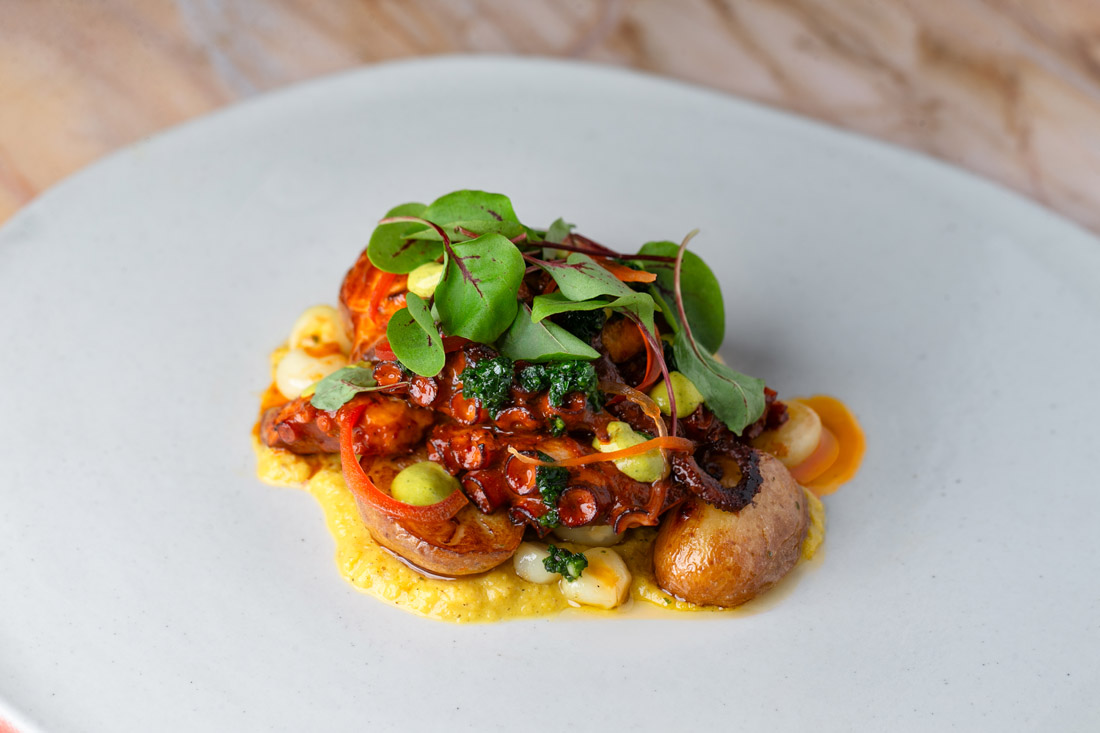 Dinner options merge tradition and innovation for refined dishes with zesty flavors. One appetizer coats octopus cooked in a Josper grill that sears and smokes with a smokysavory- spicy anticuchera sauce. It’s piled onto a plate alongside corn and potatoes with a drizzle of tangy chimichurri sauce, dots of sweet cream and a crown of red-veined sorrel leaves.